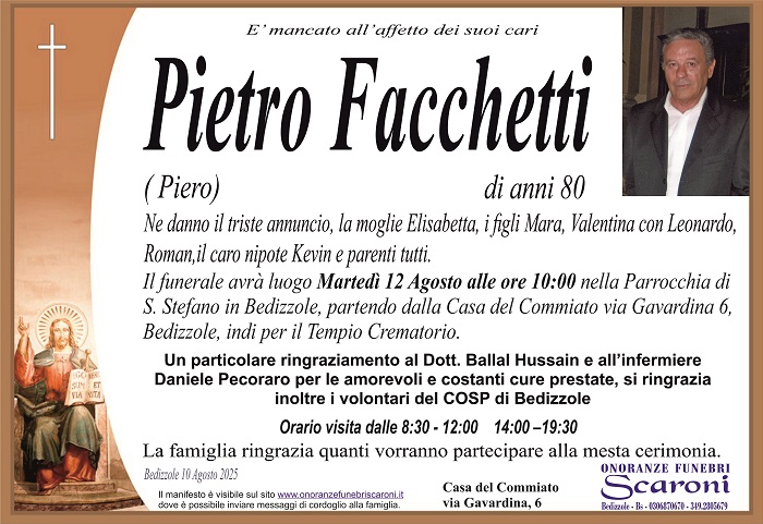 Sono così dispiaciuto per la perdita di Pierino. Le mie condoglianze e il mio affetto alla famiglia Facchetti. Mi dispiace di non poter essere lì con tutti.